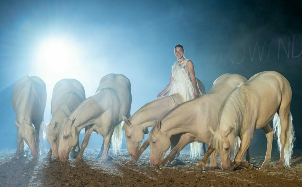 Bei MONDWIND „Der Zaubermantel“ wird Iseulys Deslé ihre berührende Freiheitsdressur mit ihren weißgolden schimmernden Cremello-Pferden präsentieren.